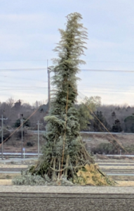 写真は数日前の昼間に撮影したので、まだお焚き上げするものはあまり置かれていませんでした。当日は小さい火種から一つの松明に付け、その後順番に松明に火を付けていきます。松明を持って東、南、西、北の順に回ってやぐらを囲み、一斉に点火をします。どんど焼きのお振舞いは楽しみの一つです。いつも豚汁とおしるこが振舞われています。寒い中の豚汁はとても温まります。そして、長蛇の列に並んで縁起物である紅白餅が刺さった竹の棒をゲットします。お焚き上げの火でお餅を焼くのですが、これがまた大変です。ご想像の通り、とても熱いので近づけません。昔と変わらず、多くの親御さんが我が子のために頑張る姿が見受けられます。理想は、近づいて良い角度で竹を土に刺し一時退散、頃合いを見て回収です。しかし、うまく刺すことはできないため、出来るだけ顔を背けて耐えます。以前眼鏡のレンズが熱に負けて歪んでしまったので眼鏡をはずし、今年も何とか上手く焼けました。きっと良い年になることでしょう。